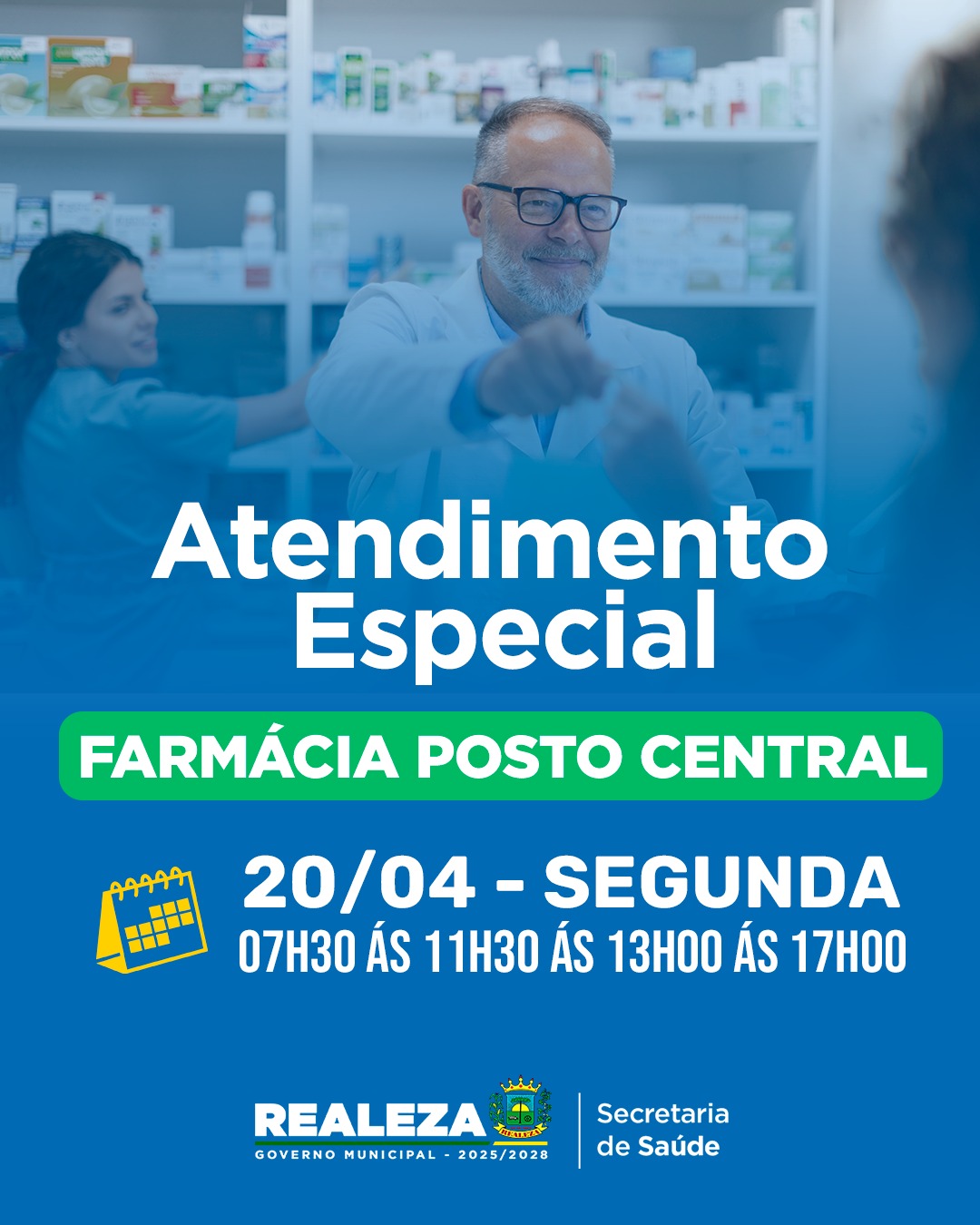 A população de Realeza contará com atendimento especial na Farmácia Posto Central na próxima segunda-feira, dia 20 de abril....