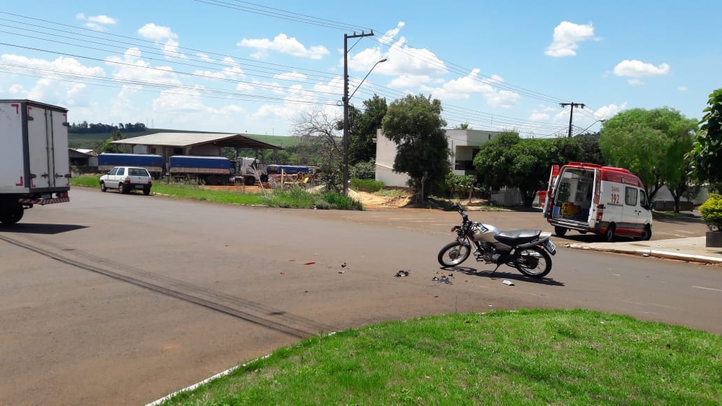 O acidente envolveu uma motocicleta Honda CG placa Mercosul e um caminhão Kia placas Mercosul.