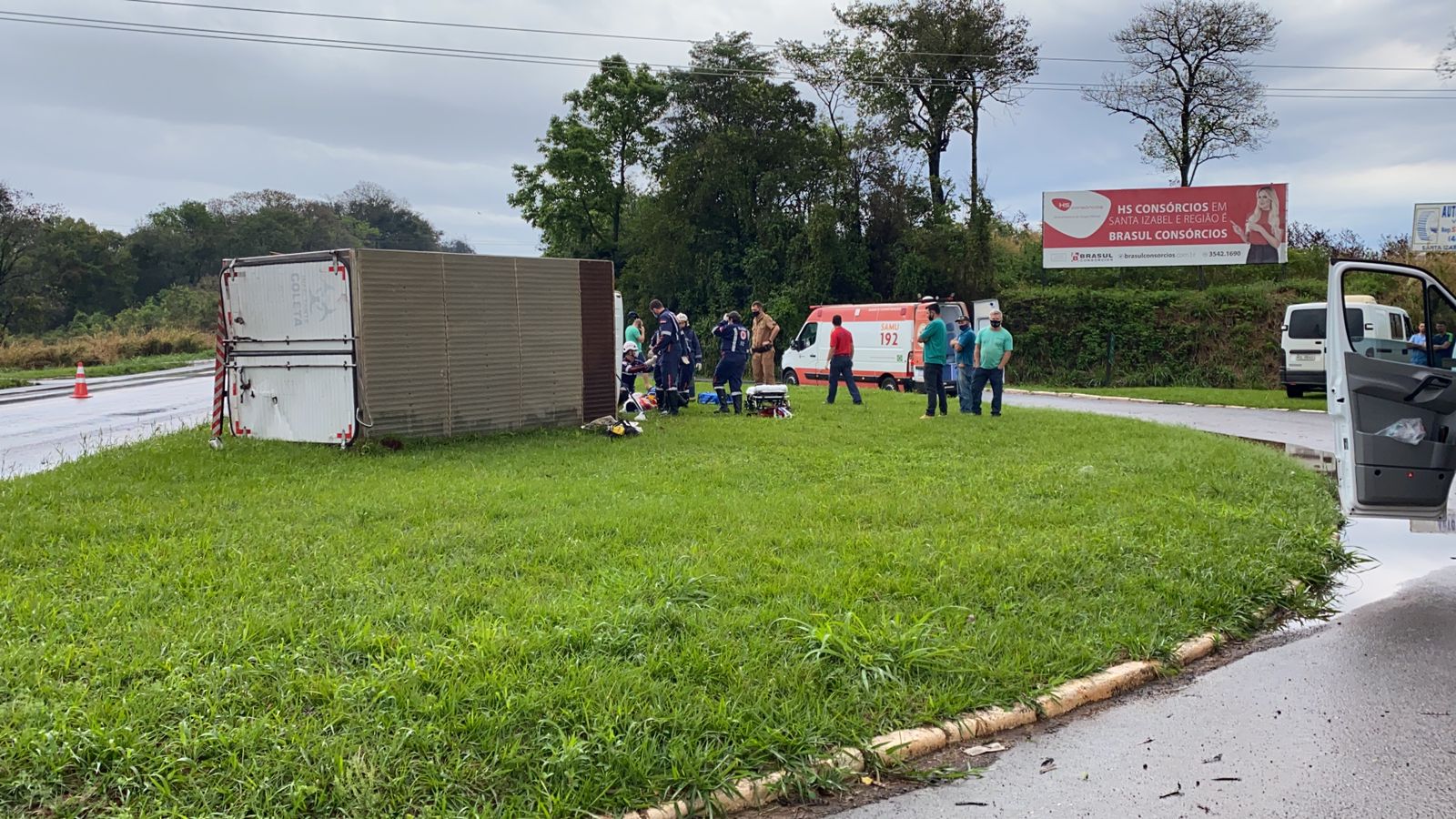 O Jornalismo Ampére AM e Interativa FM esteve no local e apurou que o primeiro caminhão adentrou da PR 182 e provocou a batida. Com o impacto os dois veículos pararam no canteiro do trevo e o baú acabou tombando. Duas pessoas estavam nele e foram atendidas no local por equipes do SAMU de Ampére e Realeza. Após foram encaminhadas para o Hospital e Maternidade Santa Rita.