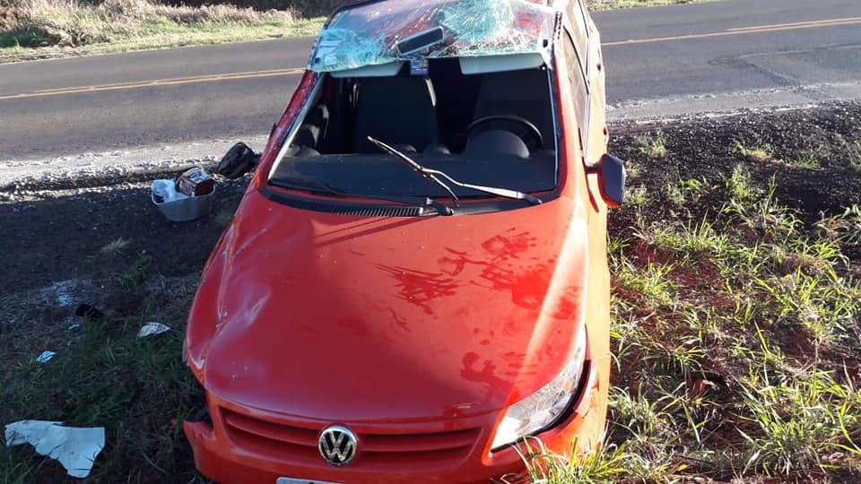 Um Gol com placas de Santa Izabel do Oeste, que era ocupado por um casal, que estava logo atrás tentou desviar para não atingir a Van o que fez com que o automóvel colidisse contra um barranco e vindo a capotar.