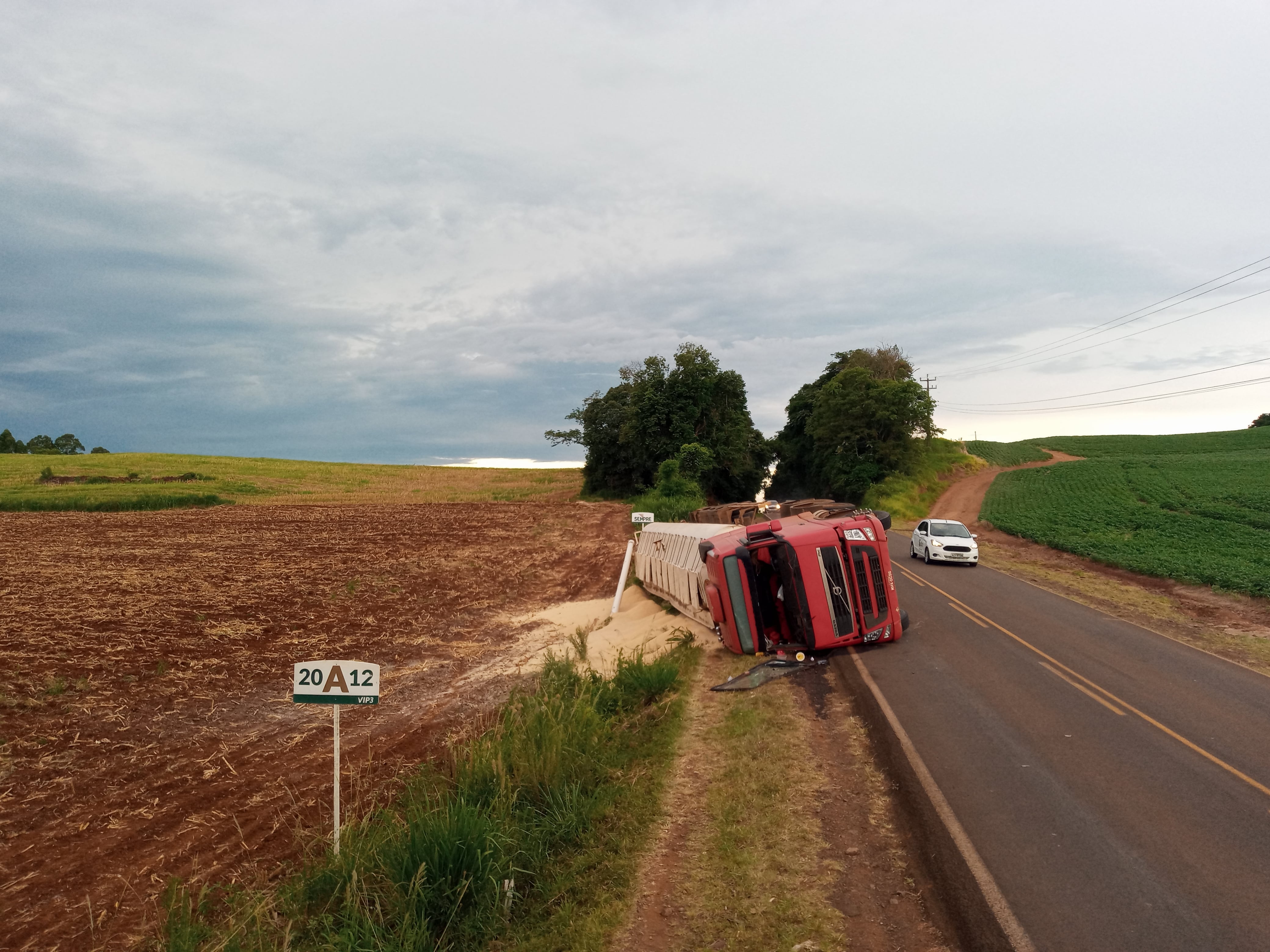 Um caminhão Volvo emplacado em Dois Vizinhos carregado com ração tombou na pista, após o condutor perder o controle da direção.