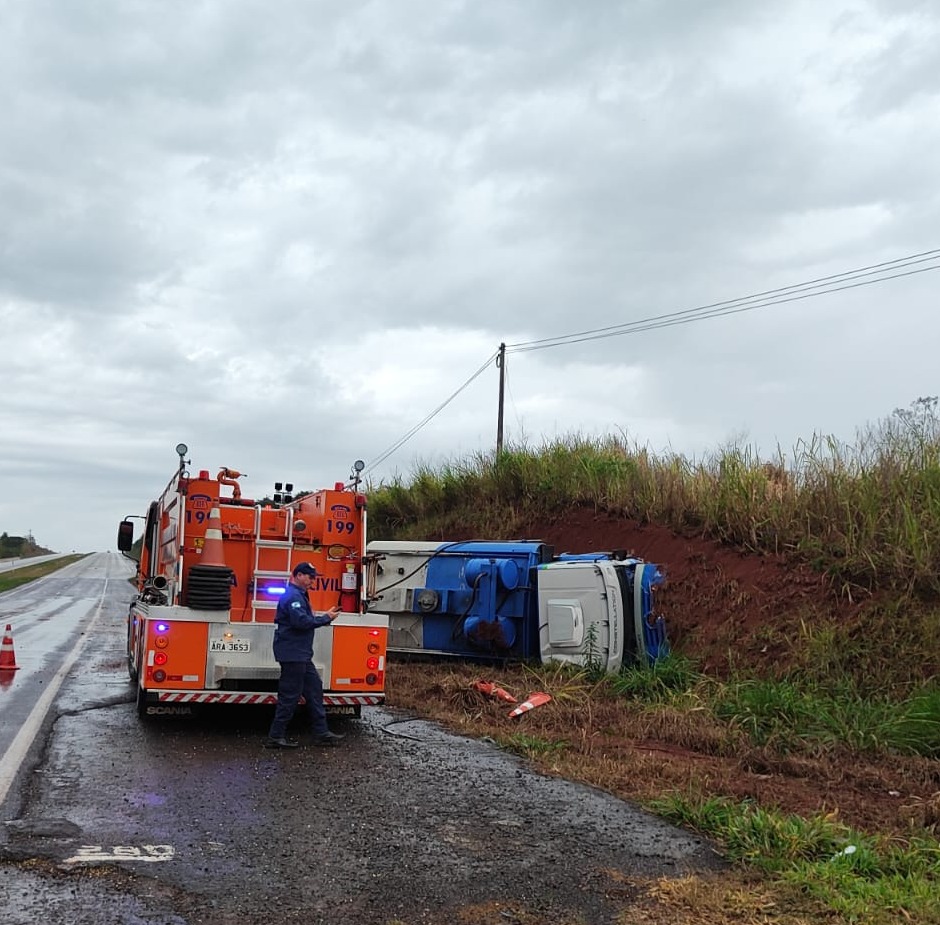 O condutor do caminhão estava seguindo no sentido Capitão Leônidas Marques para Realeza quando perdeu o controle da direção, atravessou o canteiro central da rodovia e tombou no sentido contrário da pista.