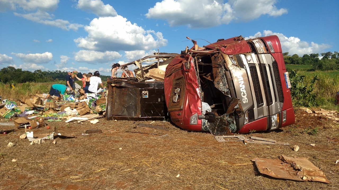 O acidente envolveu um caminhão Scania/P320, placas Mercosul, que saiu da cidade de Barracão, carregado com frutas e seguia apara o Oeste do Estado.