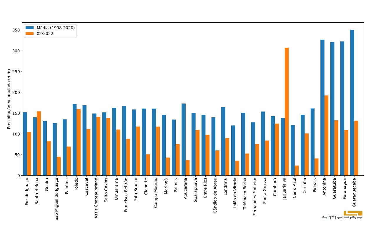 Em apenas dois pontos a chuva ultrapassou a média histórica para fevereiro. Em Jaguariaíva choveu 307,4 mm, quase 170 mm acima da média climatológica. Santa Helena também registrou boas precipitações. A chuva forte, porém, foi concentrada em poucos dias, como ocorreu em Umuarama, no dia 22, e em Pinhão, no dia 25, causando transtornos à população.