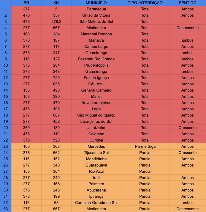 A PRF (Polícia Rodoviária de Federal) do Paraná atualizou a situação das rodovias federais do estado. As informações foram postadas pelas redes sociais da polícia às 10:00 desta terça-feira.