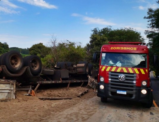 Conforme informações, o caminhão Scania 380 que tracionava um bitren, carregado com areia seguia sentido Verê à Dois Vizinhos quando o condutor perdeu o controle da direção saiu da pista e capotou.