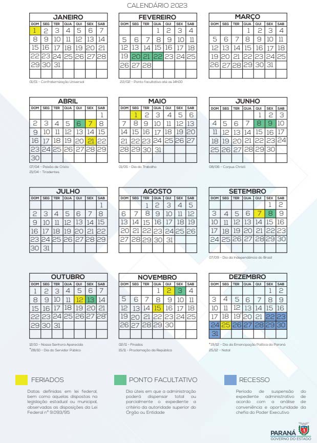 O governador Carlos Massa Ratinho Junior assinou nesta quarta-feira (14) o decreto 12.816/2022 que institui o calendário oficial de 2023. Ele estabelece os feriados e os dias de recesso e ponto facultativo para os órgãos e entidades da administração direta, autárquica e funcional do Poder Executivo.