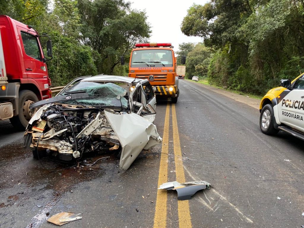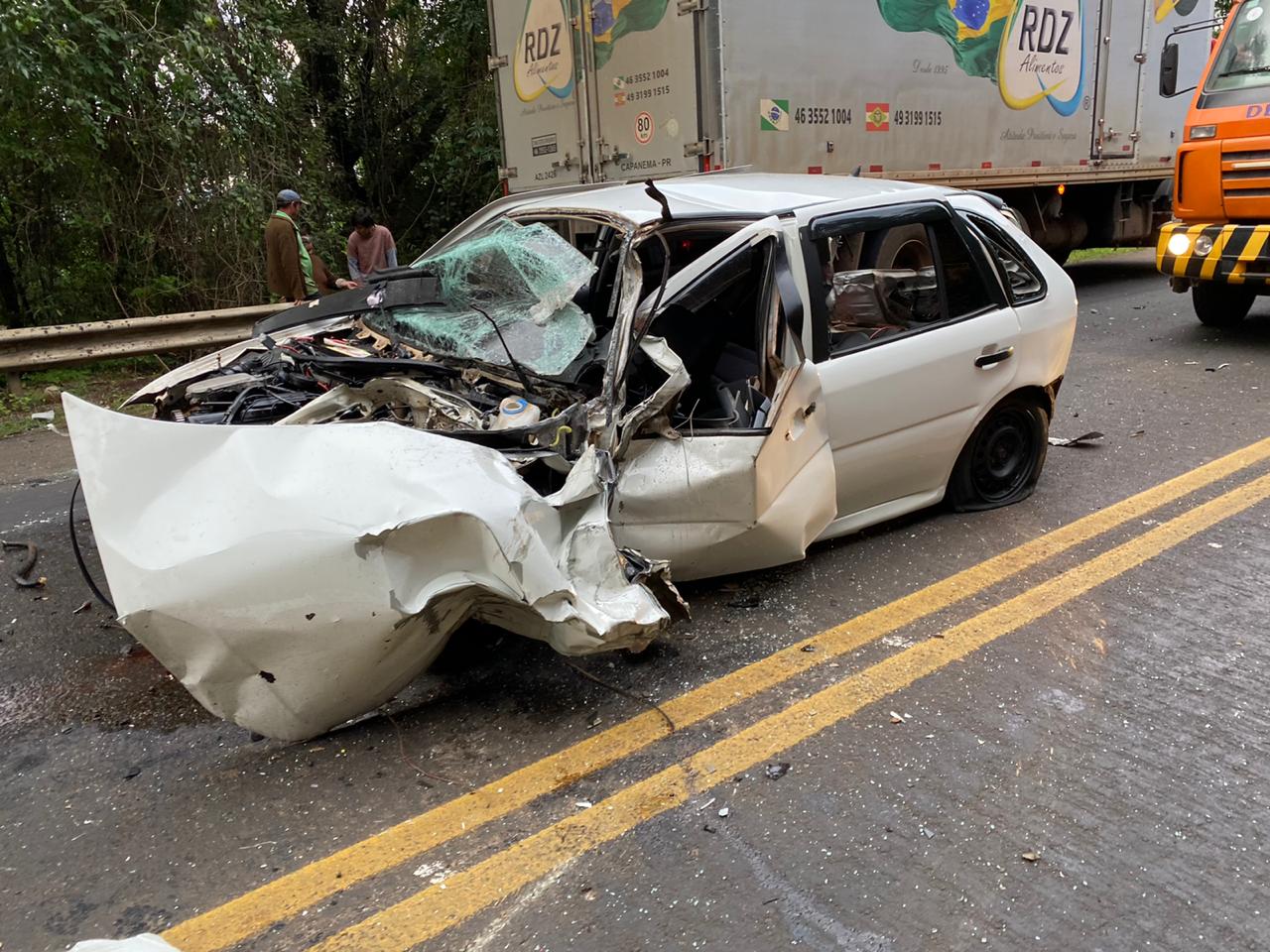 Um grave acidente foi registrado na tarde desta quinta-feira, 20, em Ampére. O fato foi registrado por volta das 16h15 na PR 182, perto da comunidade de Santa Apolônia, sentido a Francisco Beltrão. Se envolveram na colisão um Gol com placas de Pato Branco e duas carretas, uma com placas de Água Doce/SC e outra do Paraguai.