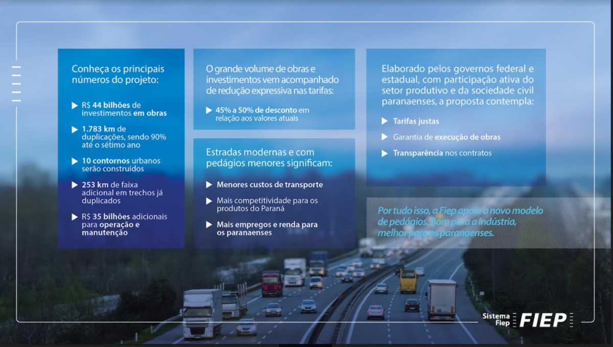 Para o setor produtivo, o modelo apresentado tem potencial para ampliar a competitividade dos produtos paranaenses. “Tarifas menores e estradas melhores reduzirão os custos de transporte para as empresas, tornando o Paraná ainda mais atrativo para investimentos, o que se refletirá em mais empregos e renda”, afirma o presidente da Federação das Indústrias do Paraná (Fiep), Carlos Valter Martins Pedro.