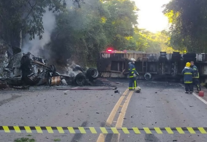 Após tombar, o caminhão pegou fogo. O motorista ficou preso às ferragens e morreu carbonizado.
