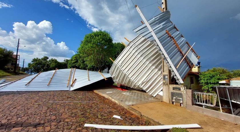 Com a intensidade das rajadas de vento, arrancou o telhado de uma residência e arremessou sobre alguns veículos que estavam estacionados nas proximidades.