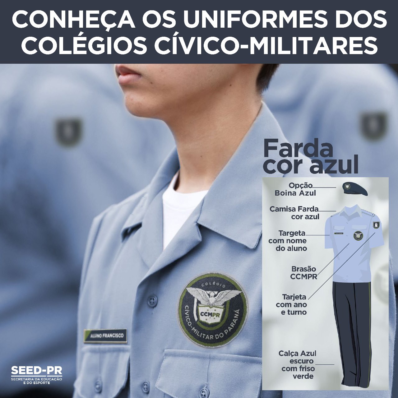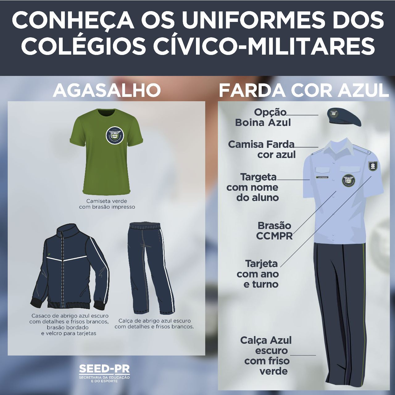 A Secretaria de Estado da Educação do Paraná (Seed) divulgou nas redes sociais oficias da pasta o modelo dos uniformes que alunos deverão usar nos colégios Cívico-Militares do Paraná. A postagem foi feita na tarde de terça-feira, 27, antes do encerramento da votação que definirá em quais escolas o modelo será implementado.