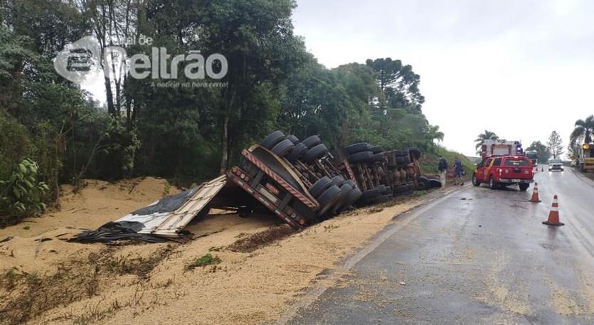 Na manhã desta quinta-feira (09) um grave acidente foi registrado na BR-280, na altura do KM 268, trecho entre Marmeleiro e Flor da Serra, na conhecida "curva da morte". Segundo informações, o motorista da carreta acabou perdendo o controle e tombando, esparramando a carga de soja pela pista. Chovia no momento do fato.