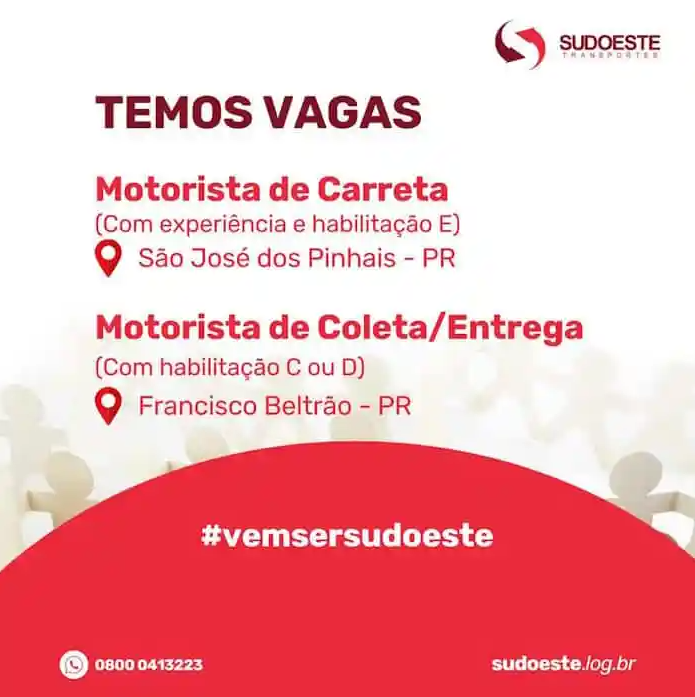 A empresa Sudoeste Transportes, fundada na cidade de Francisco Beltrão, no estado do Paraná, anunciou que está com vagas abertas para motoristas de coleta/entrega para sua matriz em Francisco Beltrão, e para motorista carreteiro, para a cidade de São José dos Pinhais, no estado do Paraná.