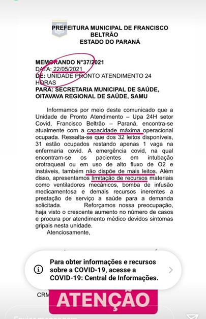 A nota que circula nas redes sociais com a informação de que a UPA 24 horas está lotada é verdadeira e foi confirmada pela Administração Municipal de Francisco Beltrão neste domingo (23). Dos 32 leitos disponíveis, 31 estão ocupados e os atendimentos emergenciais de traumas relacionados a acidentes e outros deverão ser realizados nos hospitais São Francisco e Regional, além do Centro de Saúde da Cidade Norte que está atendendo 24 horas.